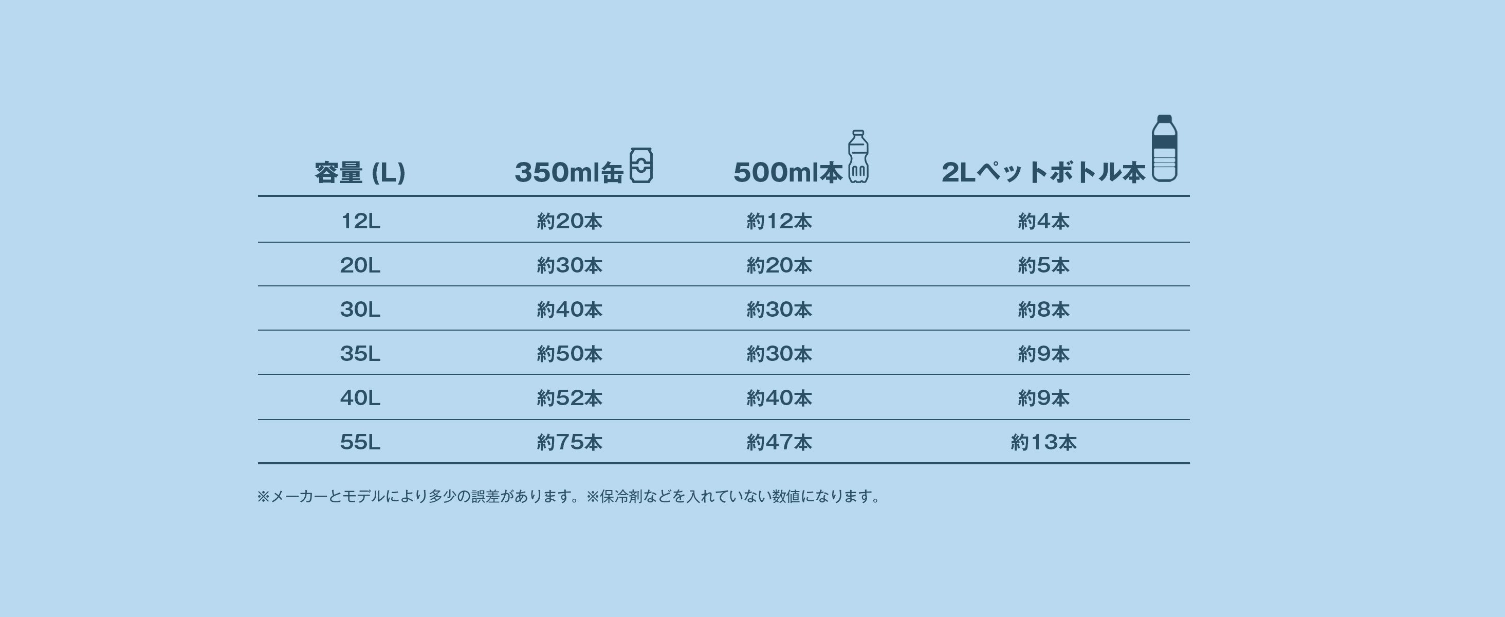 20~30本の350ml缶ドリンクを入る可能で、デイキャンプに最適。ソロまたは少人数での1泊2日のお出かけにピッタリのサイズ。