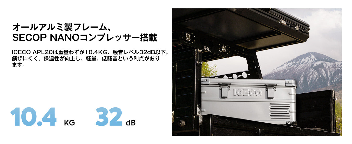 低騒音設計 & 保冷力:MAX モードで 32dB 以下、ECO モードで 30dB 以下の超低騒音設計。電源切断後も 10 時間以上の保冷性能を持ち、車内やキャンプ場での長時間使用にも適しています。