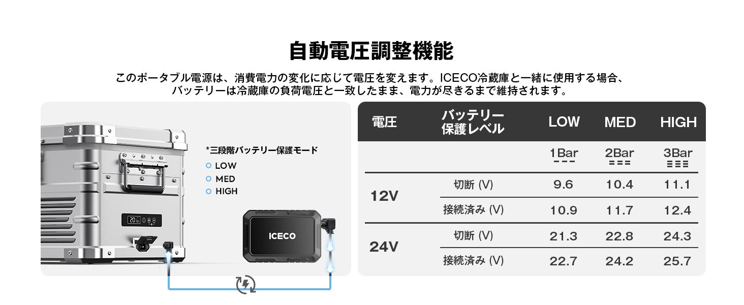 バッテリー:ICECO 製品専用で自動電圧調整機能を備え、250Wh 大容量でコンパクト(1.75kg)。3.5 時間で急速充電可能で、APL20 との組み合わせで約 8-10 時間の連続使用が可能です。また、各種デバイスへの電力供給にも対応し、メーカー 1 年品質保証付きです。