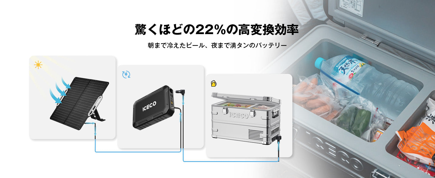 ソーラーパネル:22% の高変換効率を備え、単結晶セルと四層 EVA 構造で光透過率最大 98%。5.4kg の超軽量折りたたみ式で持ち運び便利、41°まで角度調整可能。IP67 防塵防水と ETFE フィルムによる紫外線防護で耐久性に優れ、最大 20.8V 開路電圧で各種デバイスに急速充電可能(ICECO バッテリーの満充電約 3.5 時間)。メーカー 1 年品質保証付きです。