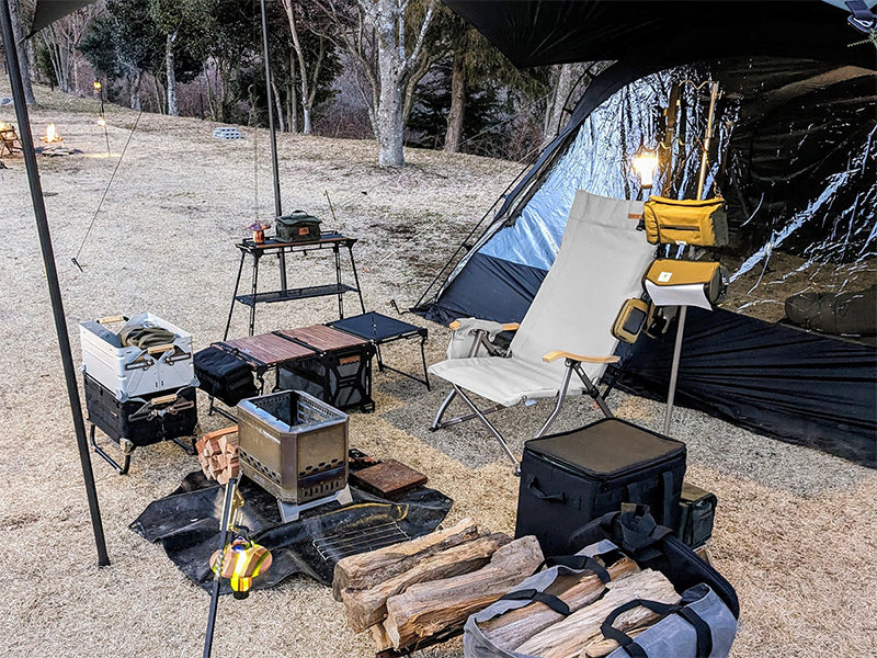 四段階のリクライニング機能:ハイバックの背面が四段階にリクライニング可能のアウトドアチェア。シチュエーションに応じて好みのポジションで寛げます。室内だけでなく、キャンプやバーベキュー、ピクニックで活躍します。