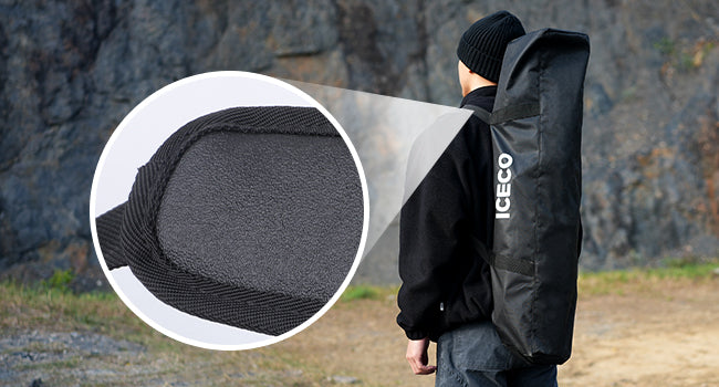 1600Dポリエステル、素材力満点!:ICECOは1600Dポリエステルを採用し、他社の600Dに比べて、アウトドアや室内の長期使用に適している。あつい季節も蒸し暑くなく、抜群の通気性と快適な座り心地を確保できます。座面の裏も防水加工し、雨でもタオルでちょっと拭くだけ座れます、雨に濡れてもカビにくい防カビ加工も施しています。通常のアウトドアチェアの座面幅は50cm前後、ICECOでは最大幅58cmのワイド設計を実現。体が大きい方でもゆったりとご使用いただけます。
