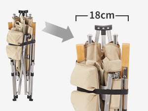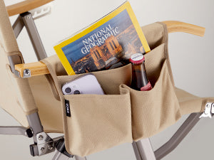 圧倒的な機能性、快適な座り心地を徹底追求!:側面着脱式ポケット付き、実際のキャンプでは「欲しいものがすぐ手に届く場所にある」という快適さに繋がってきます。竹製の手すりはオシャレだけではなく汗や指紋がつきにくい。強化フートマット、室内の床も保護する。