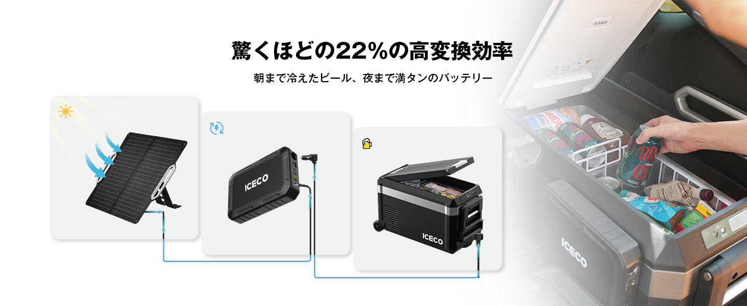 ソーラーパネル:22% の高変換効率を備え、単結晶セルと四層 EVA 構造で光透過率最大 98%。5.4kg の超軽量折りたたみ式で持ち運び便利、41°まで角度調整可能。IP67 防塵防水と ETFE フィルムによる紫外線防護で耐久性に優れ、最大 20.8V 開路電圧で各種デバイスに急速充電可能(ICECO バッテリーの満充電約 3.5 時間)。メーカー 1 年品質保証付きです。
