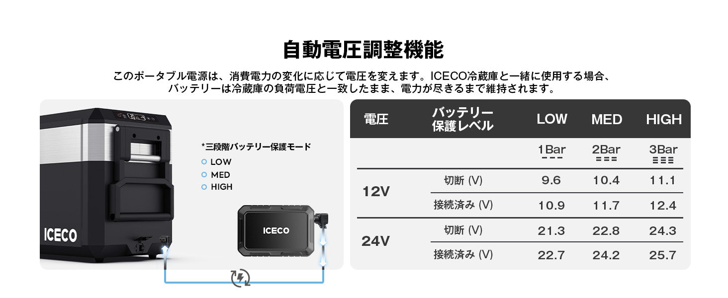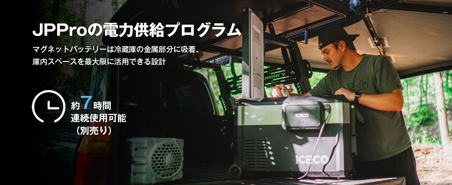 バッテリー:ICECO 製品専用で自動電圧調整機能を備え、250Wh 大容量でコンパクト(1.75kg)。3.5 時間で急速充電可能で、JPpro との組み合わせで約 7 時間の連続使用が可能です。また、各種デバイスへの電力供給にも対応し、メーカー 1 年品質保証付きです。