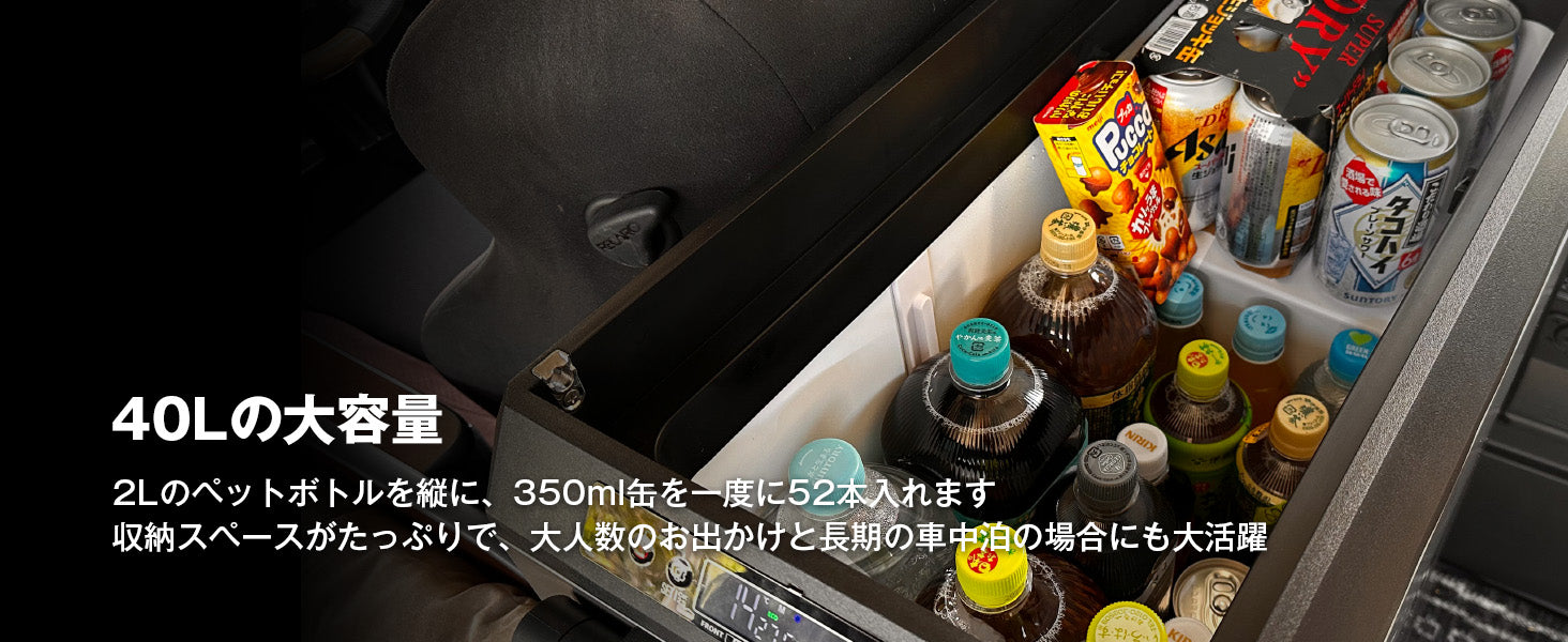 大容量&2室独立温度制御:40Lの大容量を備え、350mlのコーラ缶が40本も収納可能です。1室または2室として使用でき、それぞれ独立して温度設定が可能なため、冷蔵と冷凍を同時に行えます。家族や友人との長期の車中泊やお出かけにも十分な容量があり、一人暮らしの方にも日常的な使用に最適です。大容量でありながら、コンパクトなデザインで便利に使えます。