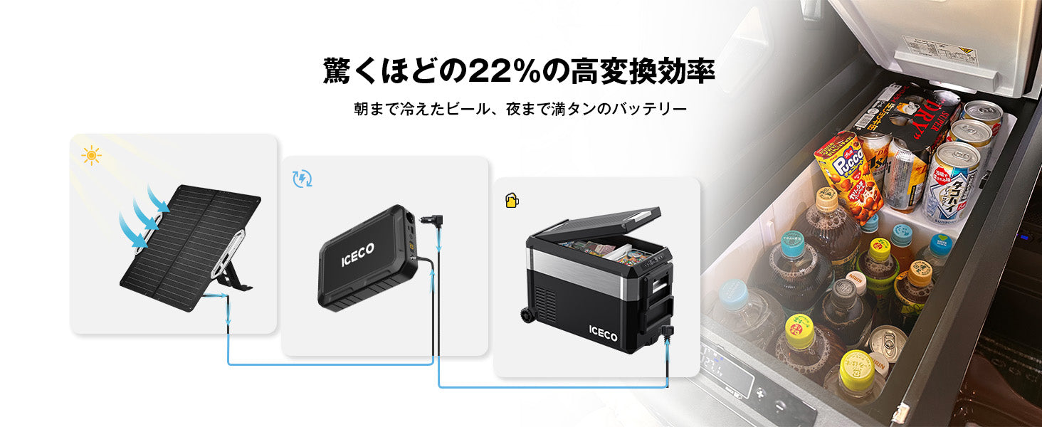 ソーラーパネル:22% の高変換効率を備え、単結晶セルと四層 EVA 構造で光透過率最大 98%。5.4kg の超軽量折りたたみ式で持ち運び便利、41°まで角度調整可能。IP67 防塵防水と ETFE フィルムによる紫外線防護で耐久性に優れ、最大 20.8V 開路電圧で各種デバイスに急速充電可能(ICECO バッテリーの満充電約 3.5 時間)。メーカー 1 年品質保証付きです。