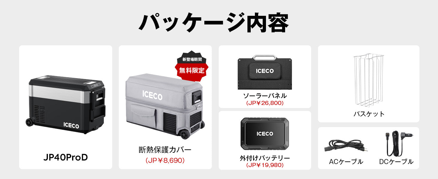 ICECO JP40ProDポータブル冷蔵庫+バッテリー1個+ソーラーパネル1個セット。ご注意:冷蔵庫とバッテリーとソーラーパネルは別々に発送され、前後に届きます。