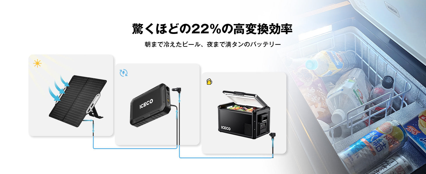 ソーラーパネル:22% の高変換効率を備え、単結晶セルと四層 EVA 構造で光透過率最大 98%。5.4kg の超軽量折りたたみ式で持ち運び便利、41°まで角度調整可能。IP67 防塵防水と ETFE フィルムによる紫外線防護で耐久性に優れ、最大 20.8V 開路電圧で各種デバイスに急速充電可能(ICECO バッテリーの満充電約 3.5 時間)。メーカー 1 年品質保証付きです。