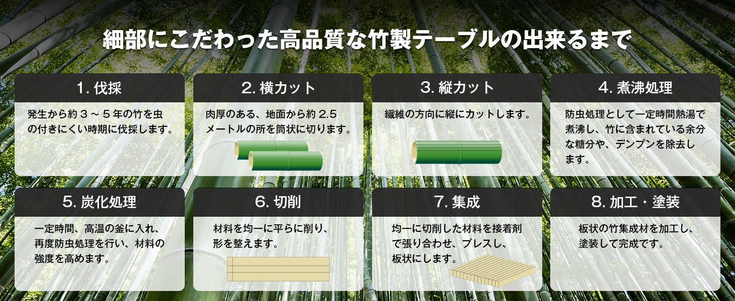 竹製天板、自然に溶け込む木目調デザイン:ICECOテーブルの天板は100%天然の竹でつくられます。竹の天然な模様と色合いがテーブルに自然の美しさを添え、現代的なシンプルスタイルや和風のインテリアにぴったり。見た目だけではなく、竹製天板手触りがよく、耐熱、掃除もしやすい。