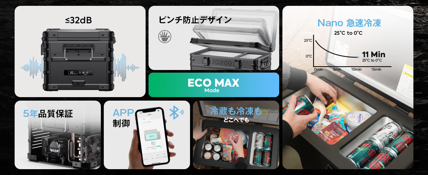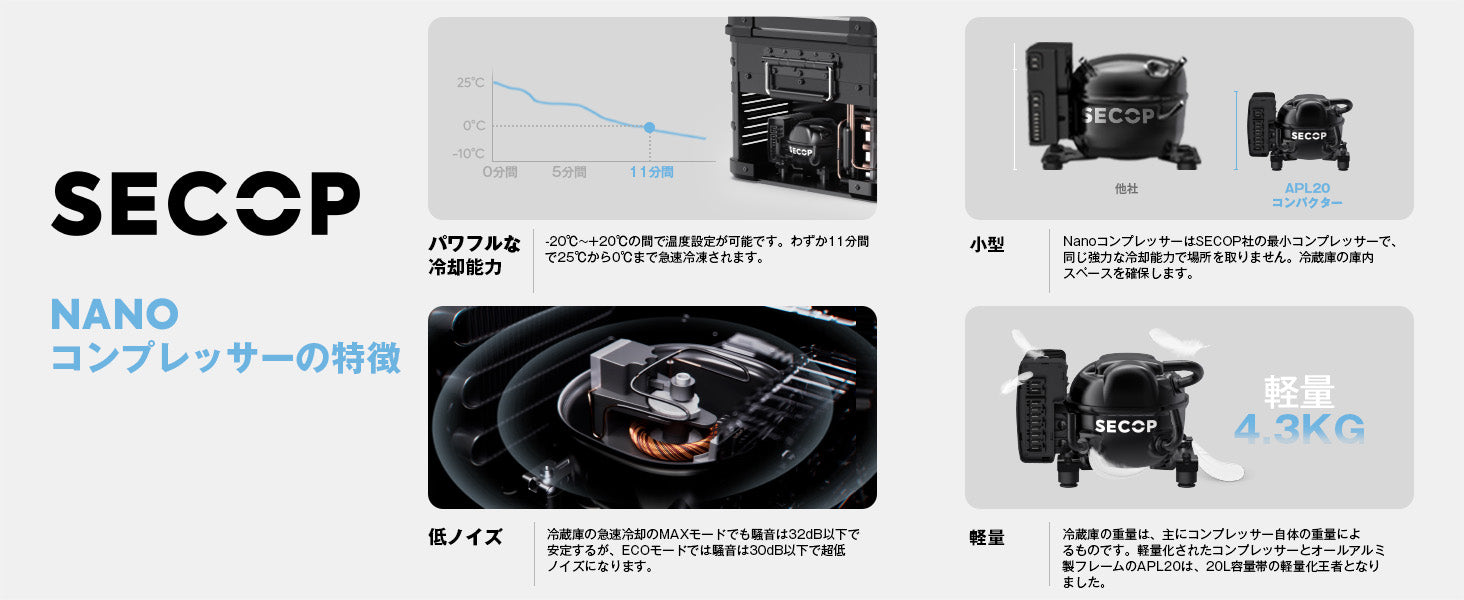 急速冷却、11分間25℃~0℃:SECOPナノコンプレッサー、高密度断熱材を採用し、安定した効率的な冷却を提供しています、電源が切られた状態で、10時間以上が保冷可能です。