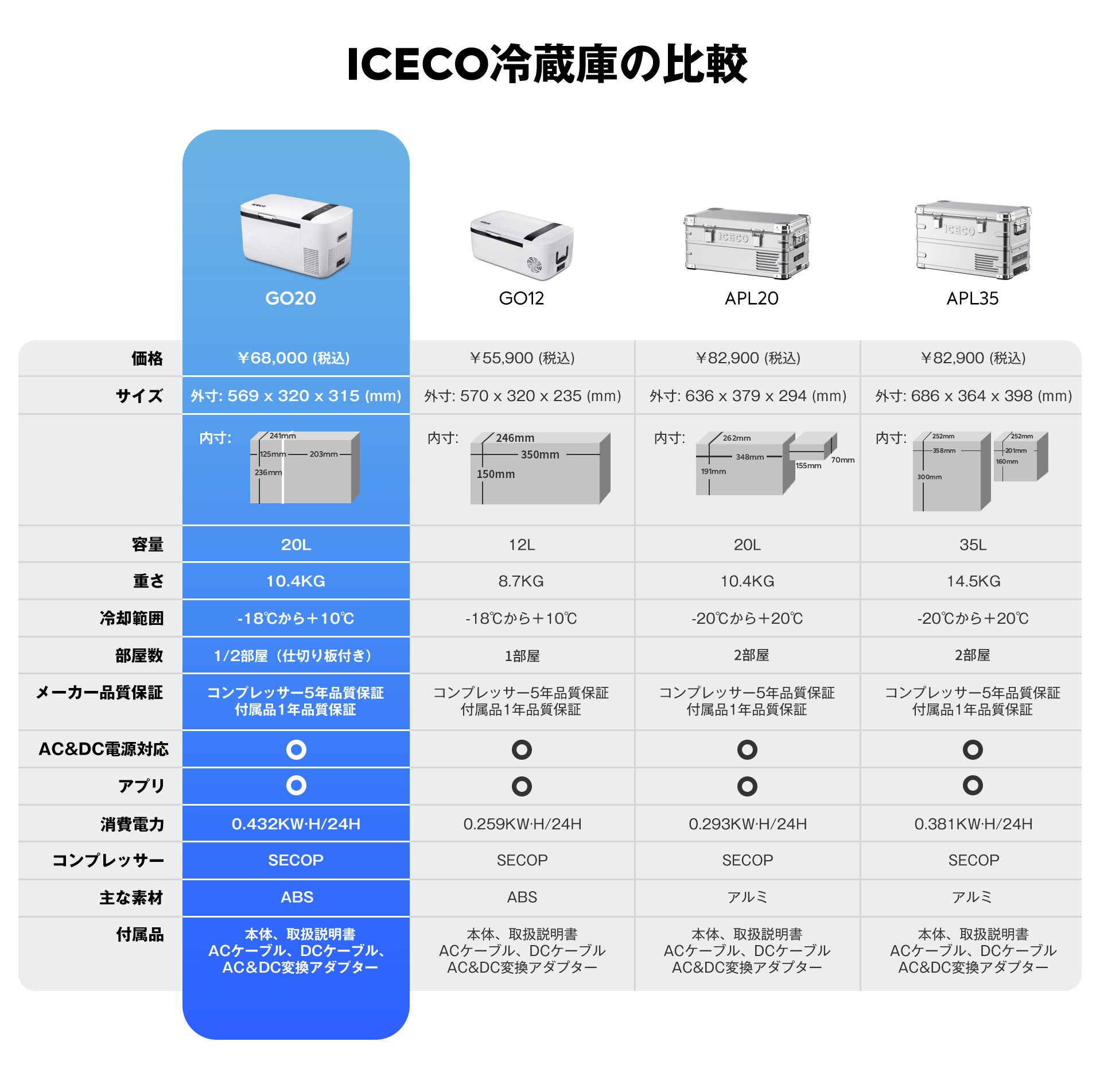 ICECOブランド品質保証:ICECOのGO20はご購入からコンプレッサーは5年保証、付属品は1年保証が適用されます。