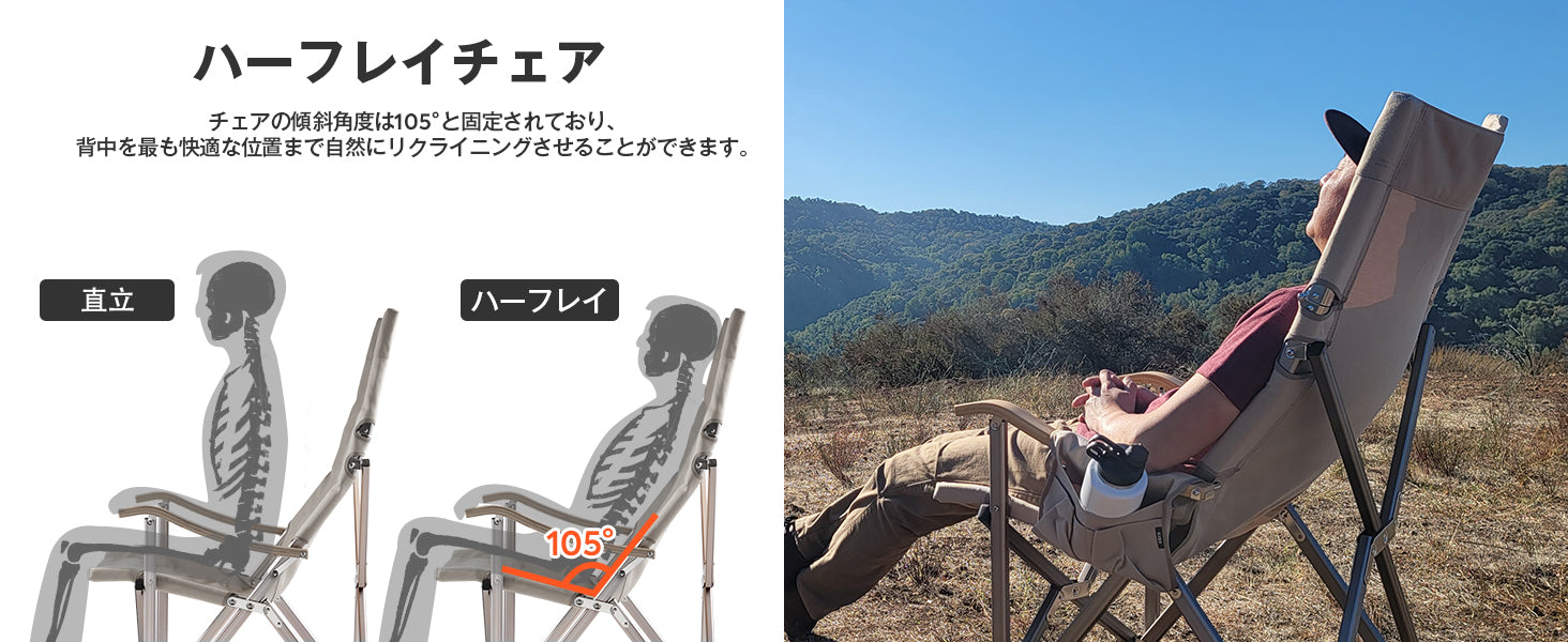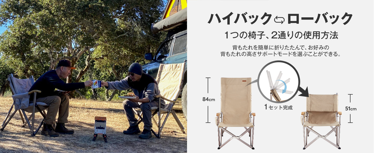 ハイ/ローバック入れ替えが簡単完成、デザイン性と機能性が大幅アップ:チェアのバックはハイ/ロー切替可能ですが、このデザインは単なるデザインのためだけでなく、ハイバックスタイルがお客様がゆったり休憩を楽しみ、頭や首を支えきれます。ローバックスタイルが最大限の手の動き、キャンプスタイルの切り替えます。