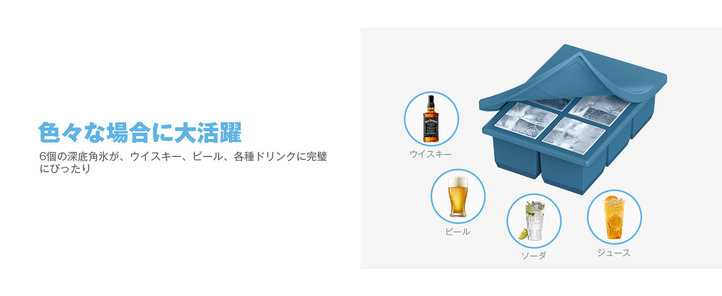 溶けにくい透明氷:四角氷、直径約5cmの大きい氷を合計6個短時間で作成!小さい氷より溶けにくいので、長く冷たい飲みものが楽しめます。