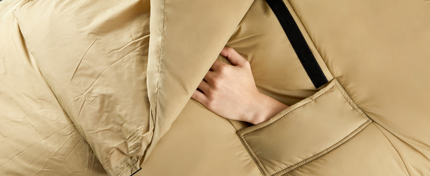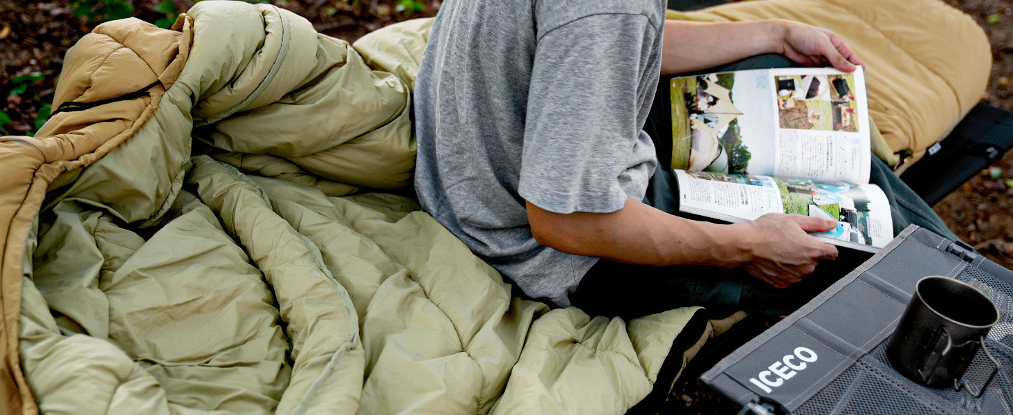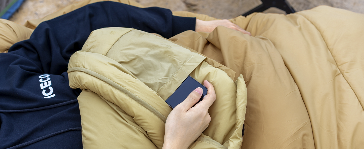 両手を伸ばせるデザイン&着脱式ハンドウォーマー!:両手が拘束されず自由に動けることを念頭に置いて、ICECOの寝袋は袖口から手を伸ばせるよう特別にデザインされていまる。全身を温かい寝袋から出ることなく、手を伸ばして本を読んだり、スマホを操作したり、食事をすることができます。さらに、取り外し可能なハンドウォーマーが付属しており、手を出して寝ても暖かく、束縛感がありません。お好きなポジションでお休みください!