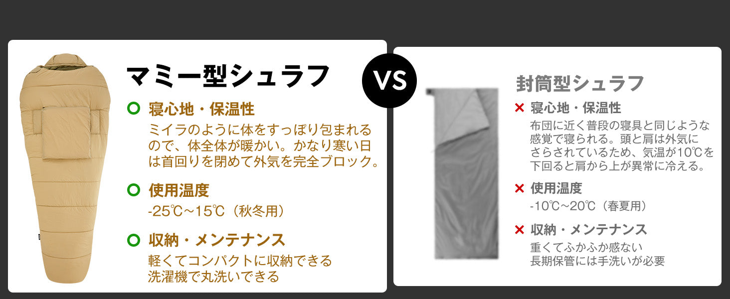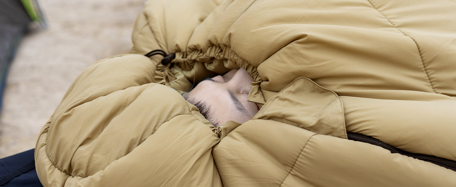 封筒型よりも暖かいマミー型寝袋、極限使用温度-25℃まで!:マミー型寝袋は、体の形にフィットするように設計されており、足先から頭まですっぽり包んで保温できます。 快適温度:15℃~-10℃、極限使用温度:-15℃~-25℃。冬のキャンプでも安心して朝までぐっすり。フード部分には襟巻きと風よけストリップがあり、内外の2つのドローコードでフードのサイズを自由に調整でき、熱の損失を防ぎます。