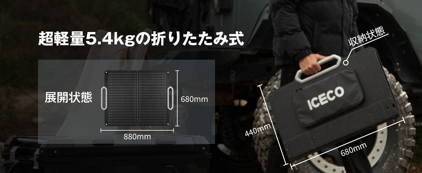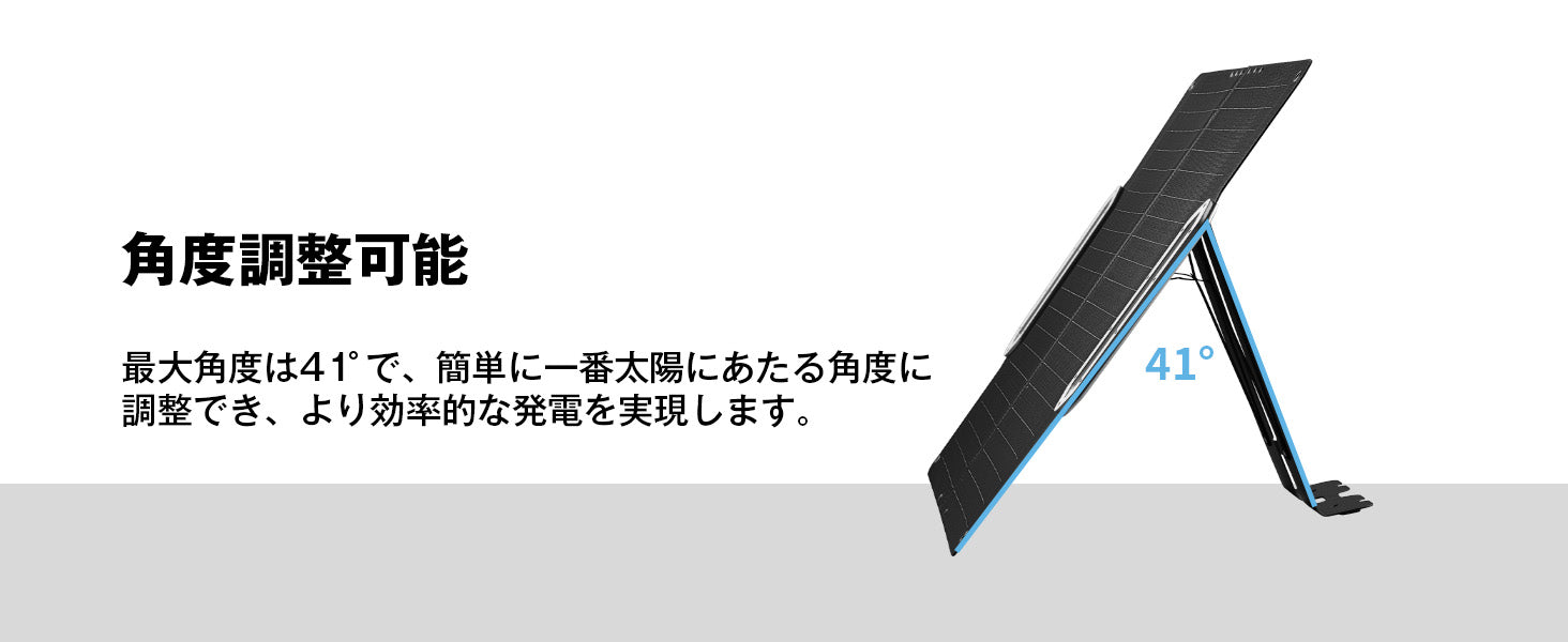 人間を中心にデザイン:超軽量5.4kg折りたたみ式、アルミニウムハンドルで持ち運び便利。展開寸法:138x54x3.5cm。収納寸法:54x39.6x6.6cm。最大角度は41°で、簡単に一番太陽にあたる角度に調整でき、より効率的な発電を実現します。