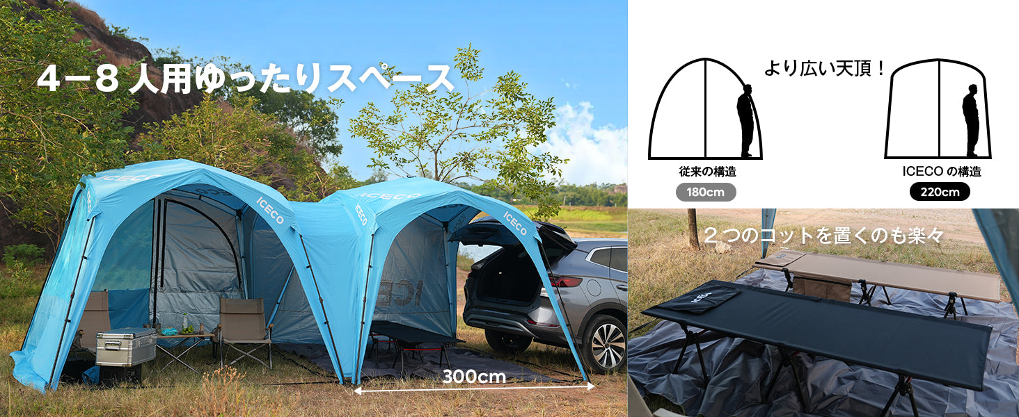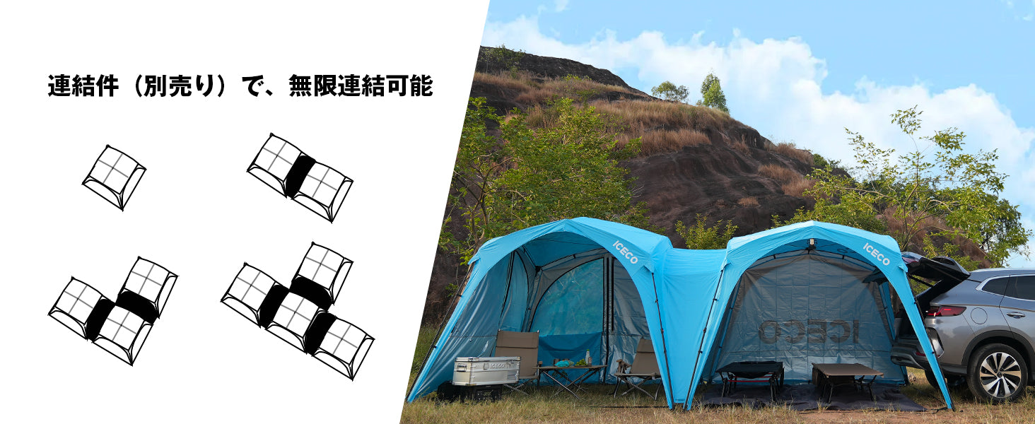 10㎡大空間、無限連結可能:ICECOのタープテントは3m×3m×2.2mのサイズで、ゆったり10㎡スペースがあります。天井も広々としており、身長2mの方でもテント内で窮屈に感じることはありません。連結件を利用して、このテントはニーズに応じて無限連結可能です。長くの“一”型のテントを作ることはもちろん、“田”型のテントも、“+”型のテントも、さらに“山”型のテントも簡単に実現します。パーティーや家族キャンプなど人が多い場合は簡単対応できます。