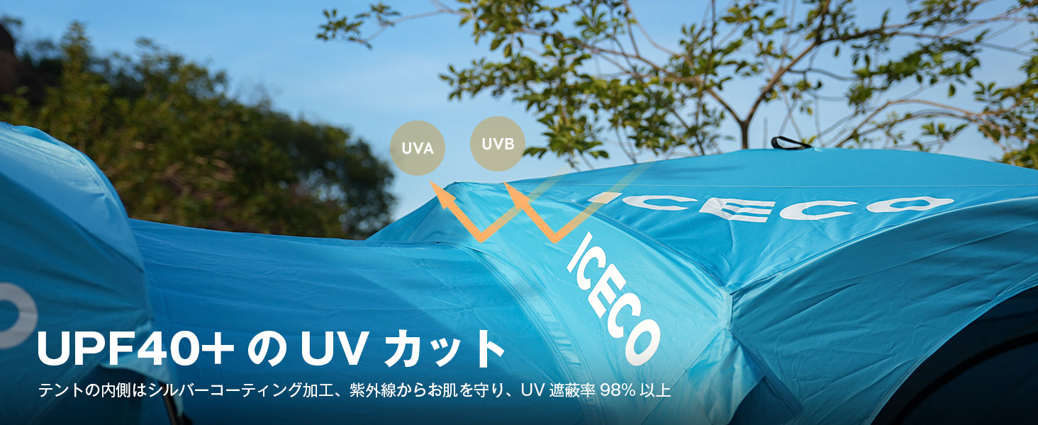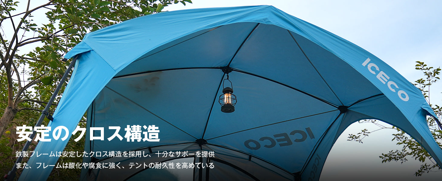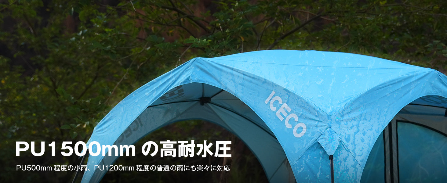 遮熱・高耐水の安定したタープテント:ICECOタープテントのフレームは頑丈で耐久性のある鉄製。安定性ある強度で、しっかりと設置が可能。強風でも倒れる心配がありません。また、150Dオックスフォード生地を採用しており、耐久性が高く裂けにくい仕様で、PU1500mmの耐水圧を備えています。天井部分と付属の4枚のサイドシートは内側にシルバーコーティングが施されており、日光をしっかり遮断。UPF40+、98%以上の遮蔽率を実現しています。