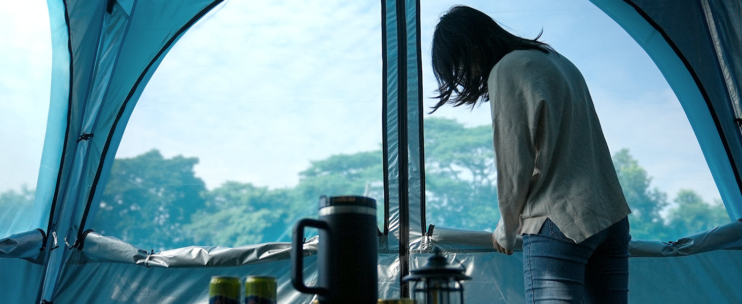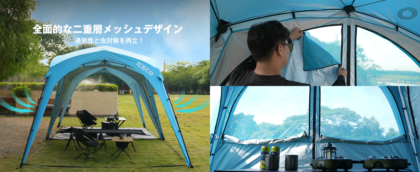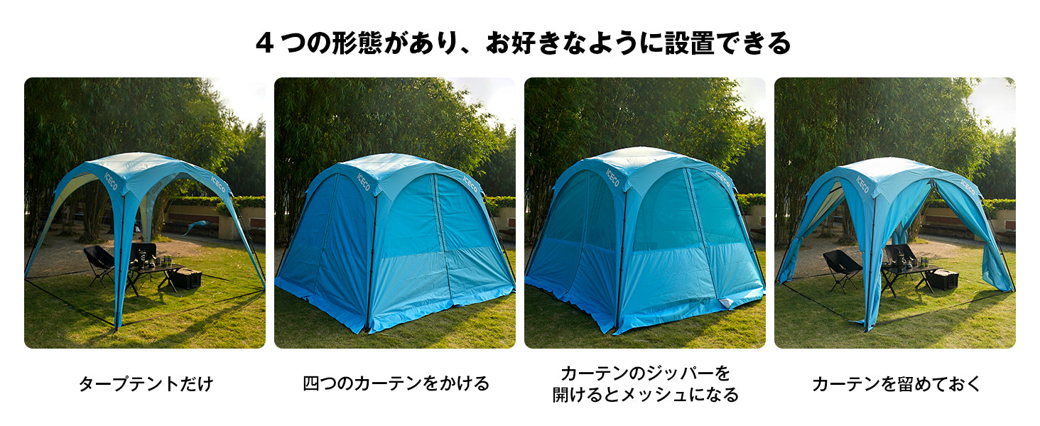 4枚サイドシート付き、全面的な二重層デザイン:ジッパー付きの二重カーテンを備えています。カーテンを取り付けることで雨よけや日よけがしっかりでき、ジッパーを開けるとメッシュ構造により蚊を防ぎつつ、通気性を確保します。