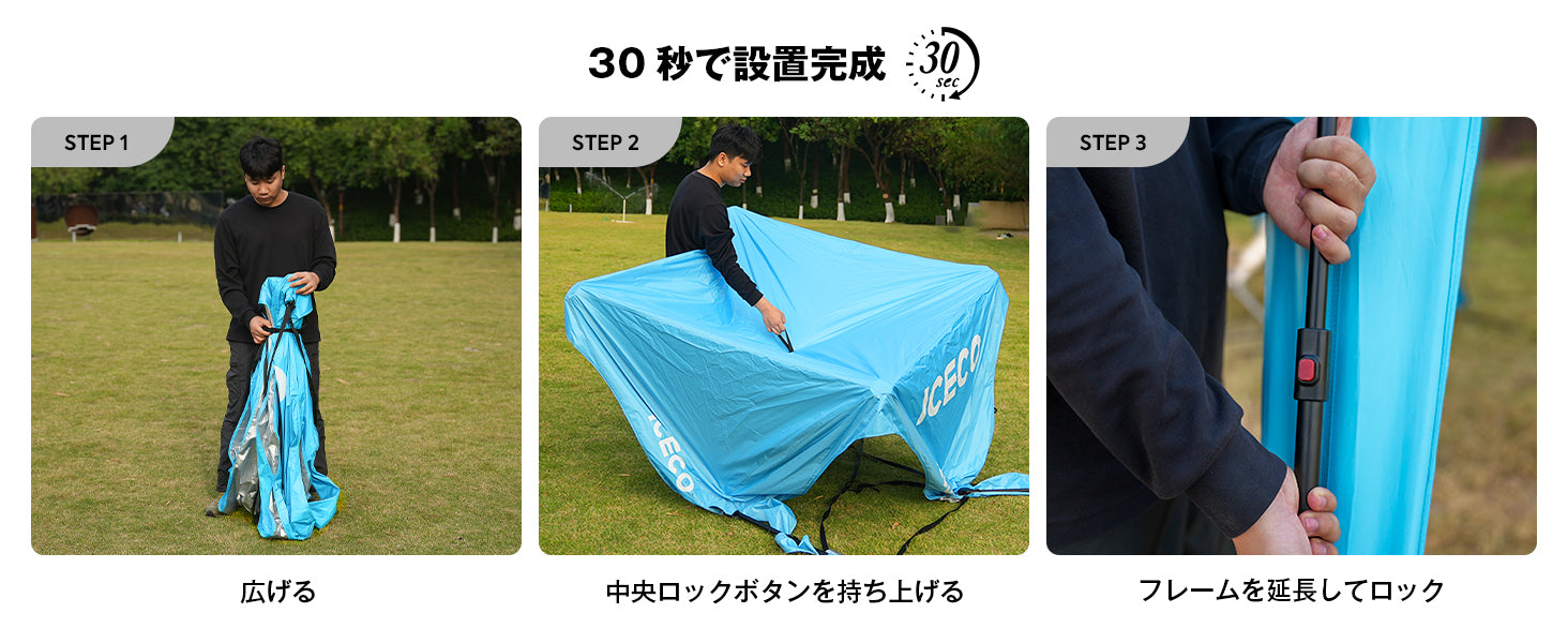 ワンタッチ式、組み立て簡単:一人だけで道具を使わず、テントトップの新設ボタンのワンアクションシステムを持ち上げ、フレームを延長してロックだけで簡単且つスピーディーに設営可能!慣れれば30秒以内で設営が完了します。収納は設営の手順を逆に行うだけで簡単です。